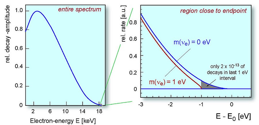 Abb.2: Bei Betrachtung des β-Spektrums des Tritiumzerfalls fehlen β-Elektronen im obersten Energiebereich, abhängig von der tatsächlichen Masse des Elektron-Antineutrinos. (Klicken Sie für vergrößerte Darstellung)